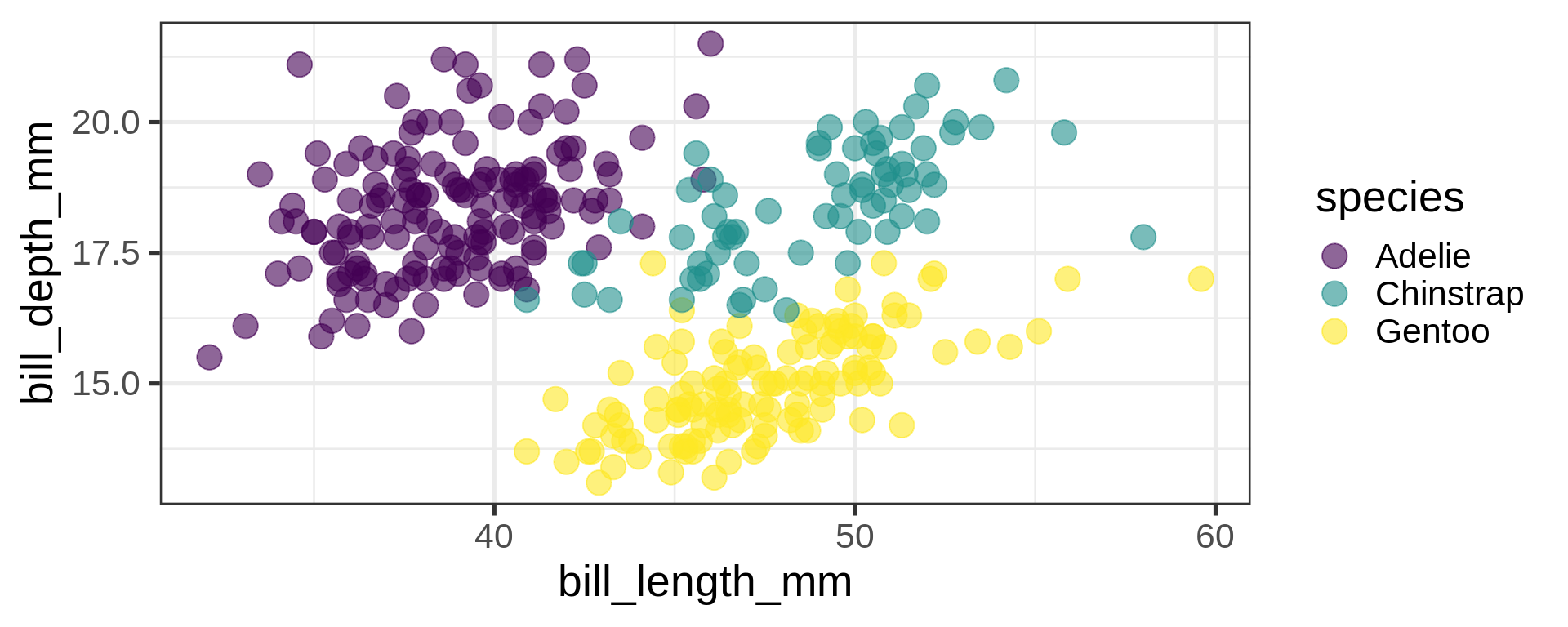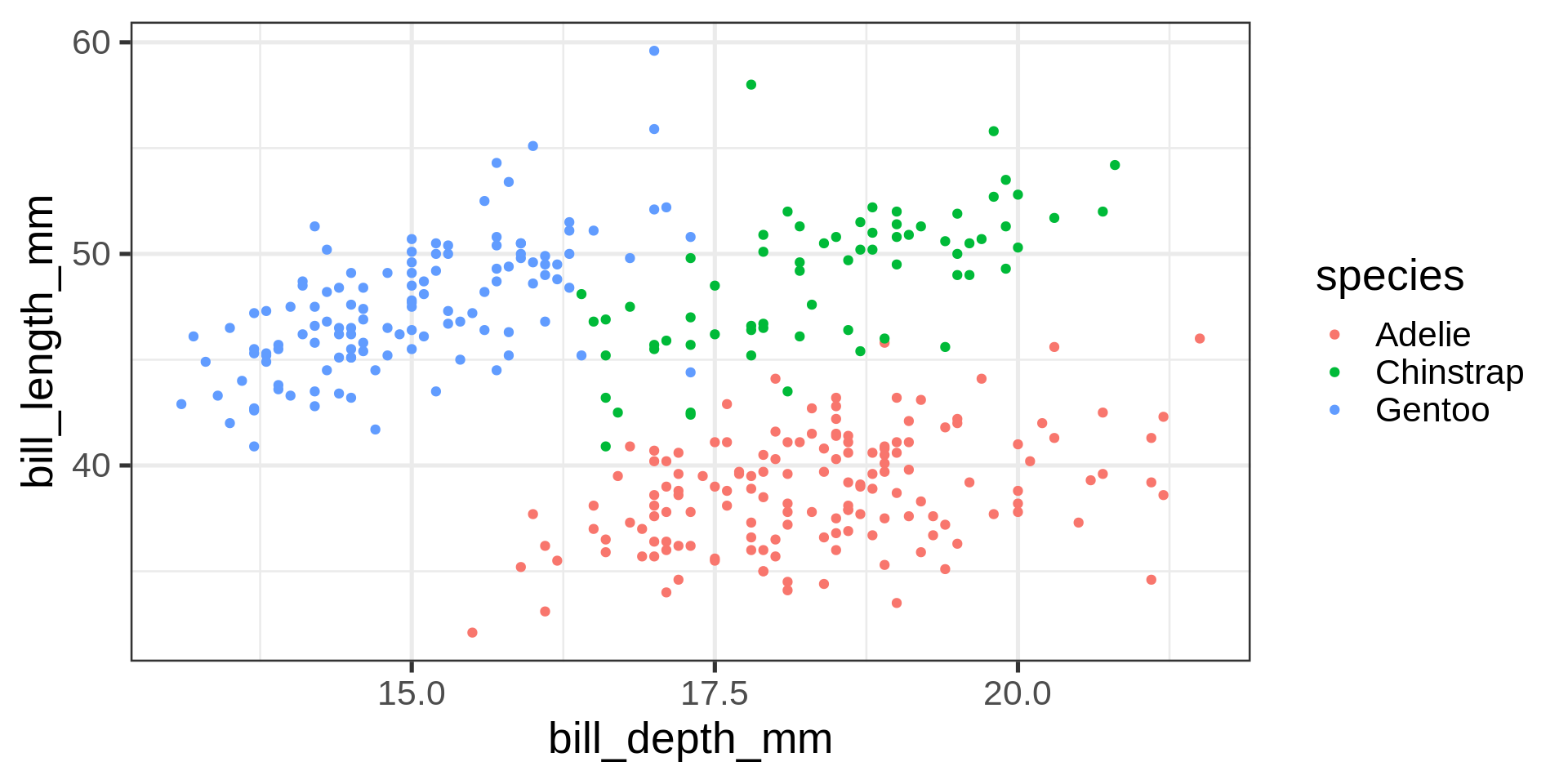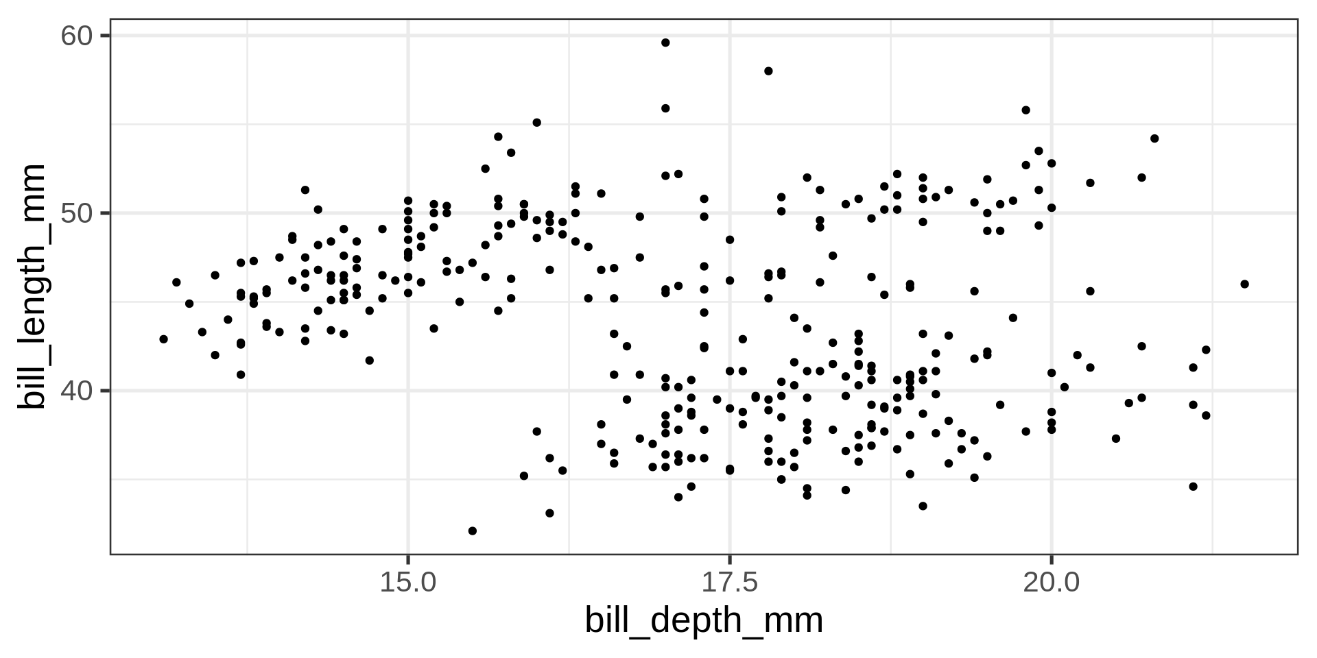 ggplot(aes(x = bill_length_mm, y = bill_depth_mm,