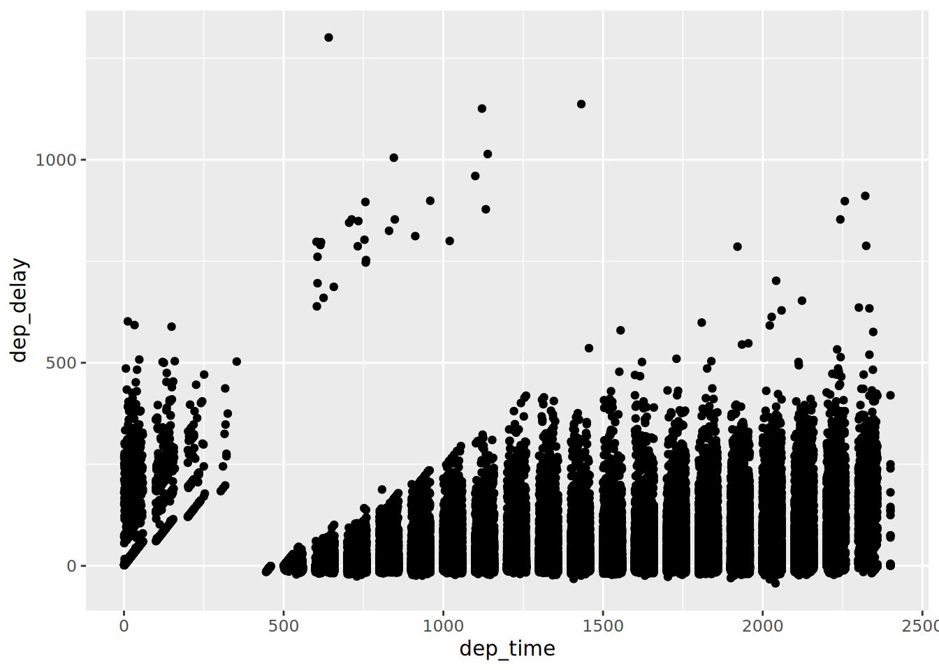 range(), mean(), median() to gauge the level of departure delaysWe will need to add na.rm = TRUE as an argument within range(), mean(), and median().